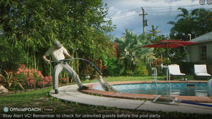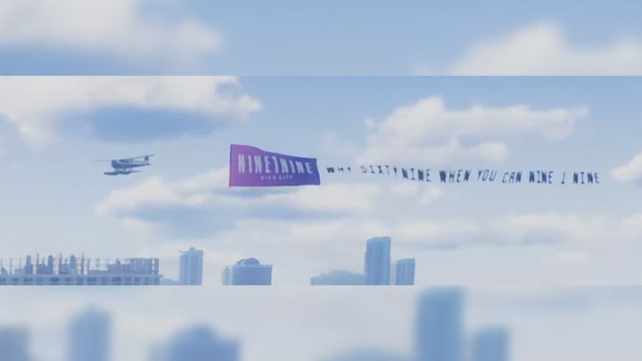 Al inicio del tráiler podemos ver sobrevolando la ciudad un hidroavión junto a un cartel que reza “why 69 when you can 919?”. Para empezar, esto podría ser una referencia directa al único avión que podíamos utilizar en GTA Vice City, el Skimmer. Este surcaba los cielos del juego portando una pancarta, tal y como se aprecia en el tráiler. Por otro lado, el slogan hace referencia al prefijo telefónico (69) de Miami, la ciudad que inspira a Vice City.