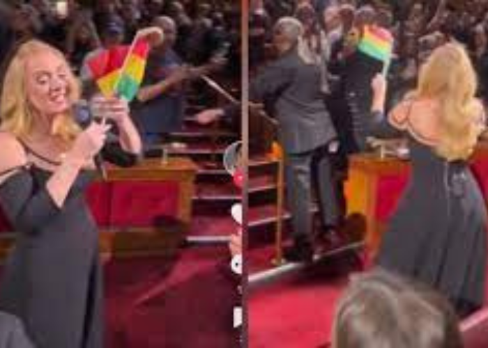 LA CANTANTE RECIBE EL REGALO Y LO ONDEA MIENTRAS CONTINÚA CANTANDO DURANTE SU PRESENTACIÓN EN LA VEGAS.